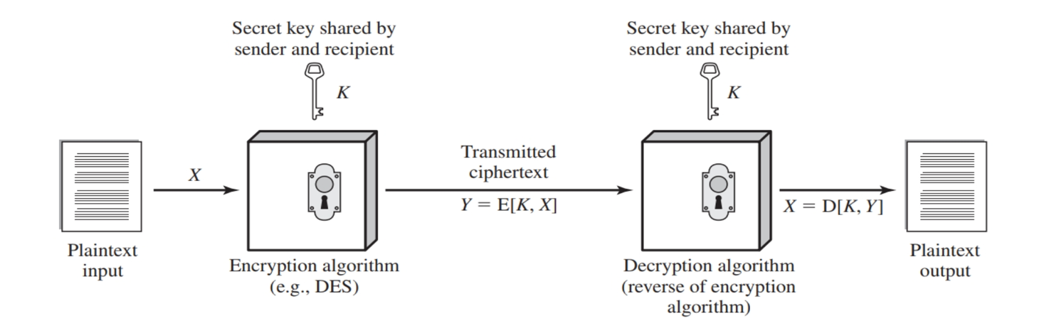1- Encryption Algorithm (Eg: DES, AES) 2- Secret key shared by sender and recipient |