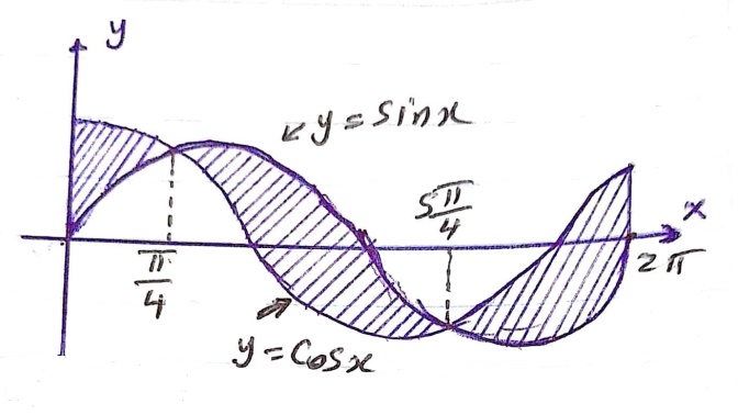 A=∫_0^(π⁄4)〖(cos⁡x-sin⁡x)〗 dx+∫_(π⁄4)^(5π⁄4)〖(sin⁡x-cos⁡x)〗 dx+∫_(5π⁄4)^2π〖(cos⁡x-sin⁡x)〗 dx