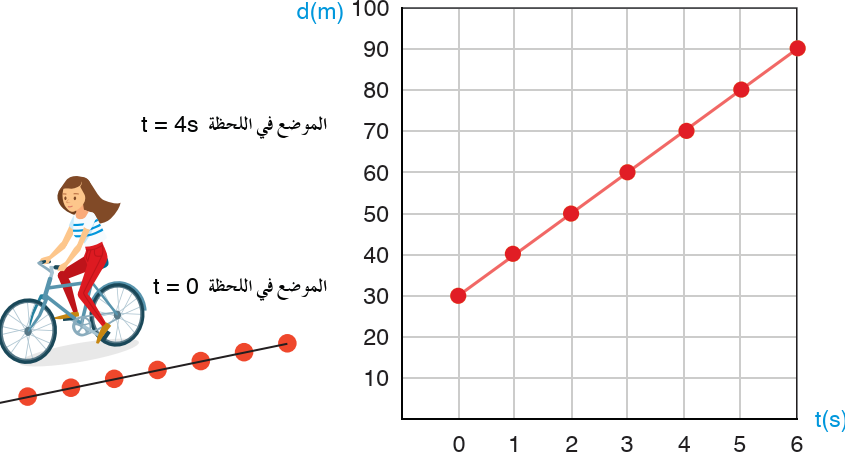 يمثل الخط البياني تغيّر المسافة المقطوعة d بدلالة الزمن t وهو خط مستقيم أي أن الحركة منتظمة.