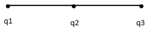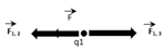 الشحنة q1 تخضع لقوتين تدافعية مع q2 وتجاذبية مع q3 وتكون المحصلة مجموع القوتين شعاعيا والقوتين على حامل وبجهتين متعاكستين.