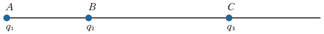 ثلاث شحنات نقطية ساكنة (q1 = 5nc , q2 = 6nc , q3 = -8nc) متوضعة على المستقيم كما الشكل، بحيث (AB = 20 cm, BC = 40 cm)والمطلوب: