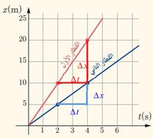 بما أن سرعته ثابته فتابع الفاصلة: X1 = v1t + x0 وحسب الخط البياني: X0=0 V1=(x2-x1)/(t2-t1) V1=(20-10)/(4-2) =5 m/s التابع الزمني هو: X1=5t |