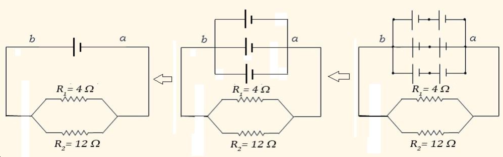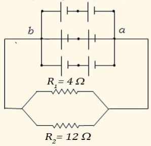 لتكن الدارة الموضحة بالشكل، المؤلفة من جملة مولدات خطية متماثلة، القوة المحركة الكهربائية لكل منها 1.5V، ومقاومته الداخلية 0.6Ω