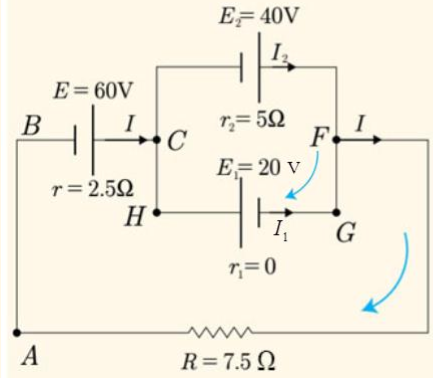 لتكن الدارة الموضحة في الشكل المجاور، المطلوب: احسب شدة كل من التيارات I1,I2,I، احسب التوتر الكهربائي بين طرفي مولد