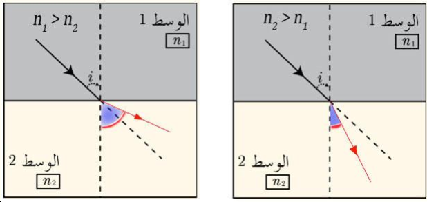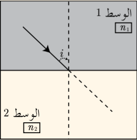 نعتبر شعاعاً ضوئياً يخترق وسط 1 شفافاً قرينة انكساره n1، وعند خروجه منه يخترق وسط 2 شفافاً قرينة انكساره n2