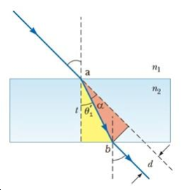 يرد شعاع ضوئي وحيد اللون، بزاوية ورود تساوي 45 درجة، على صفيحة شفافة متوازية الوجهين، ثخنها 4cm وقرينة انكسارها 1.5
