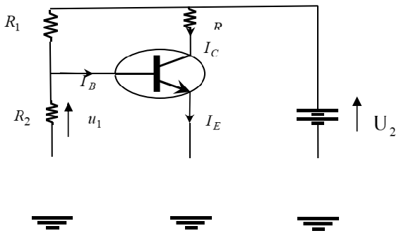 في الشكل الآتي، المعامل α للترانزستور يساوي (α=100)، ولدينا (R=2000 omega)، (U2=15V)، (R1=100 omega)، (R2=2 omega)