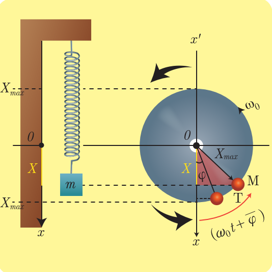 في الشكل المجاور تدور نقطة مادية M بحركة دائرية منتظمة سرعتها الزاوية ω0 وشعاع الموضع (شعاع نصف القطر) OM طويلته Xmax: