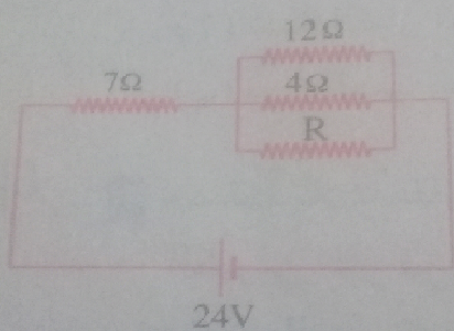 من الشكل المقابل احسب قيمة R المجهولة اذا علمت ان المقاومة المكافئة لهذه الدائرة 9.6 اوم, فرق الجهد بين طرفى المقاومة 7 اوم