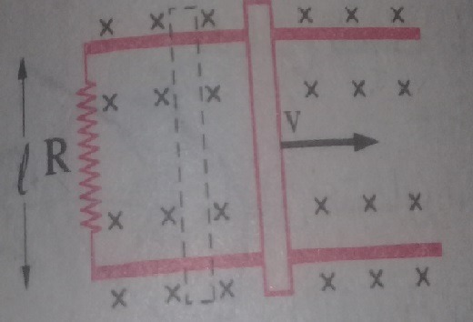 فى الشكل المقابل: اذا كانت L= 15 cm ، R = 25 Ω ، V = 8 m/s ، B = 0.6 T بفرض ان مقاومة ساق النحاس المنزلقة والقضيبين مهمله احسب: