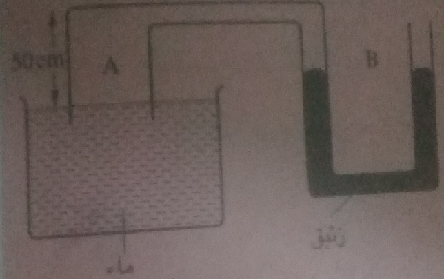 فى الشكل المقابل :انبوبة A ارتفاعها فوق سطح الماء 50 سم متصلة بأنبوبة ذات شعبتين B