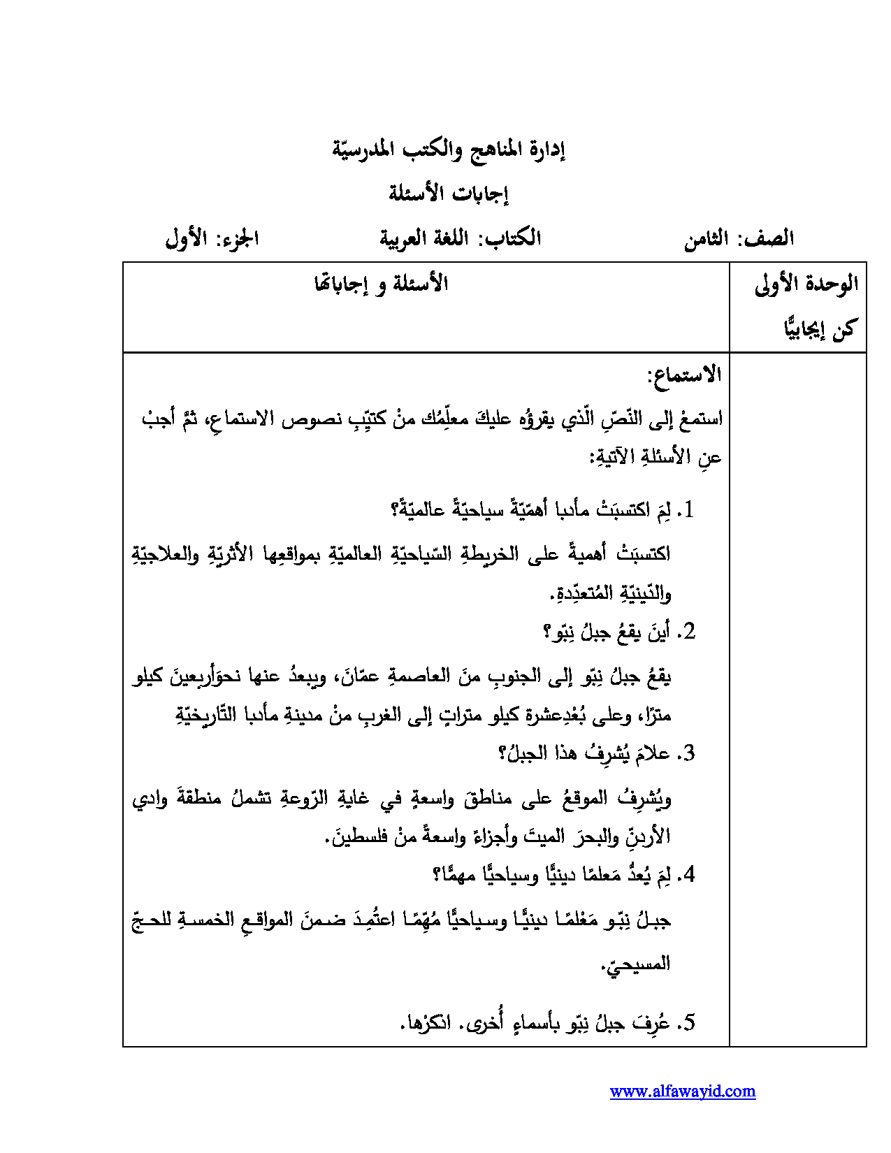 حل أسئلة الكتاب المدرسي-لغة عربية - الصف الثامن- الفصل الدراسي الاول