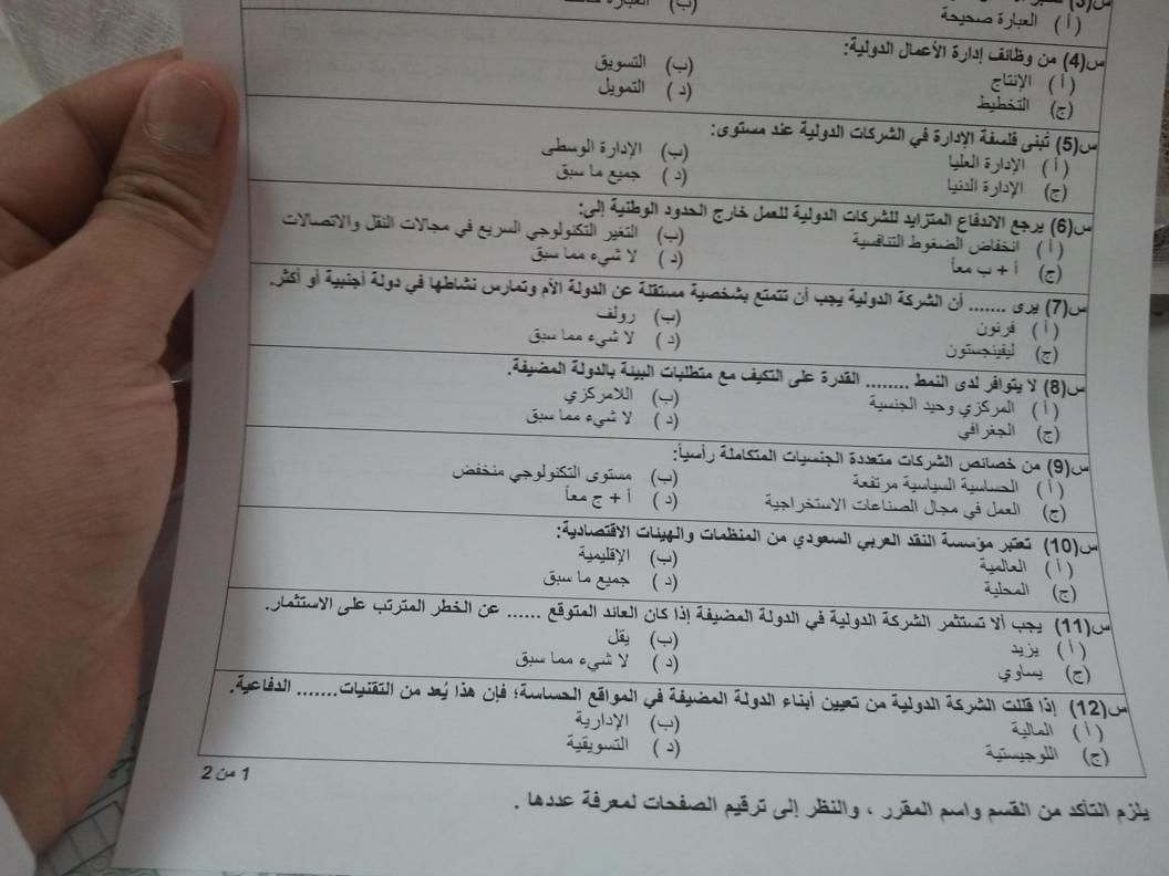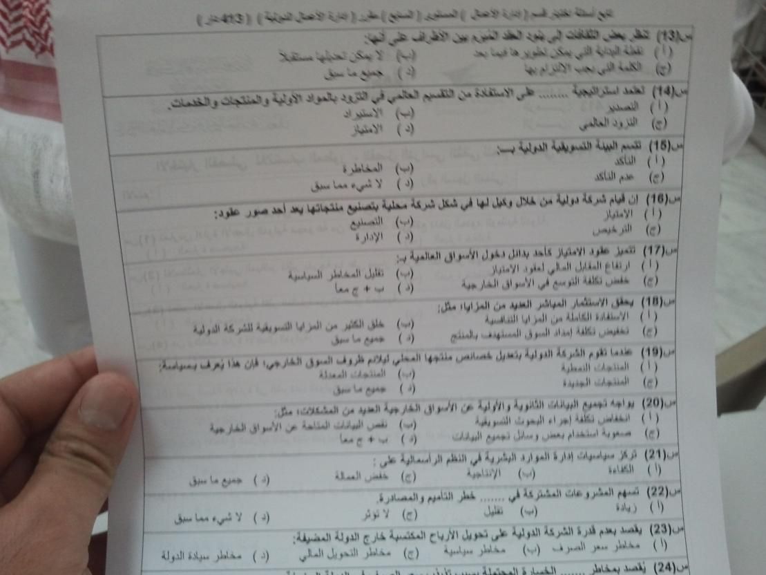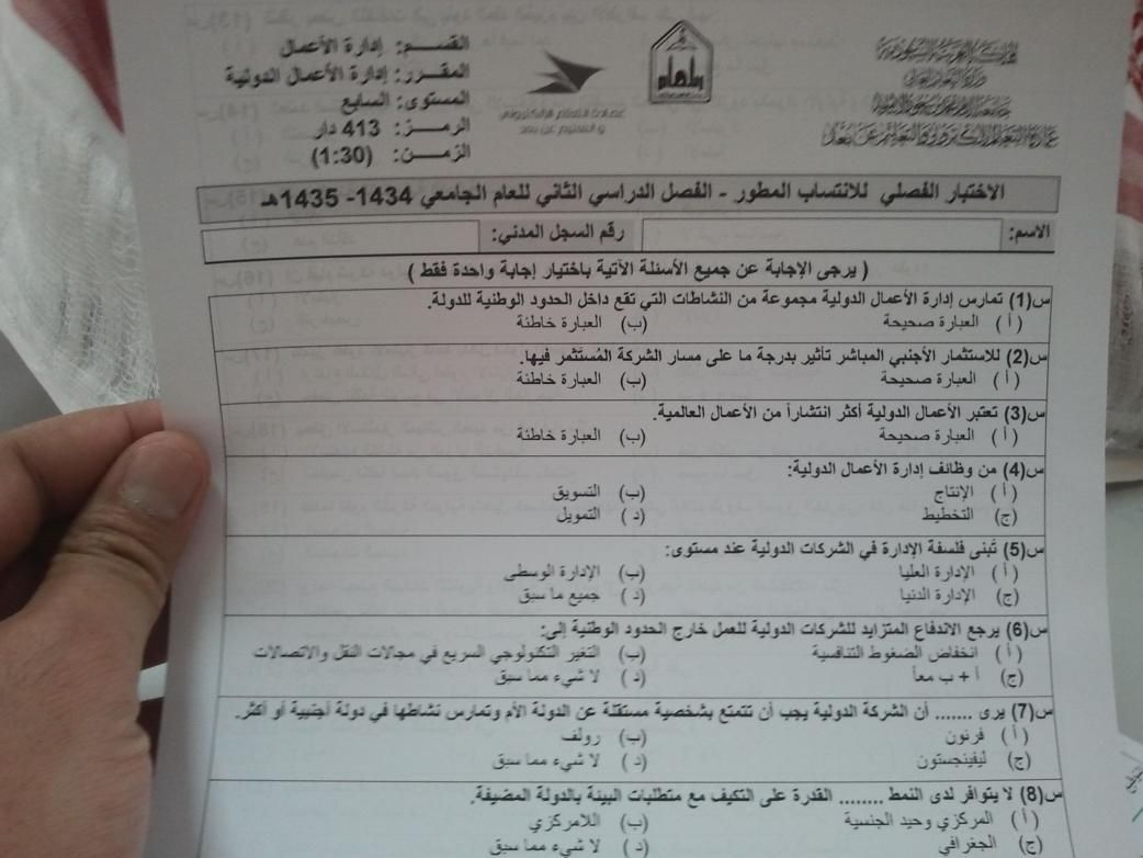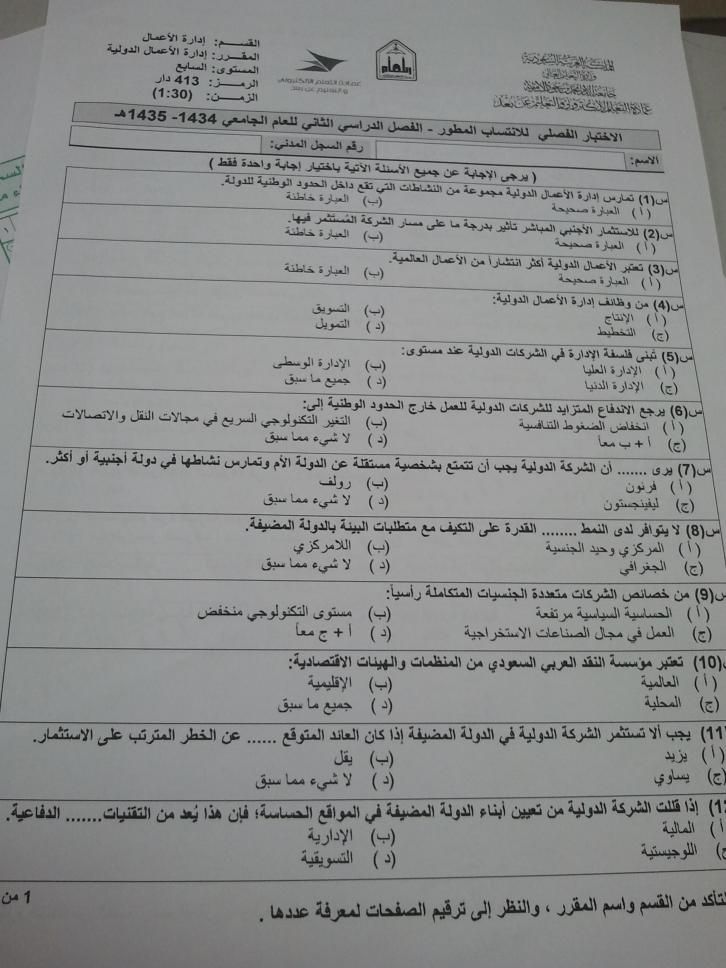 بالمرفقات تجد اسئلة إختبار مادة إدارة أعمال دولية دار 413 الفصل الدراسي الثاني 1435هـ.