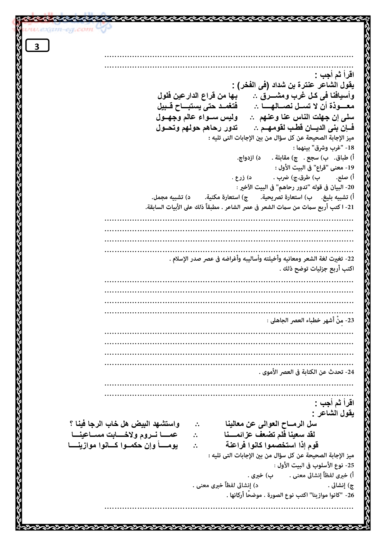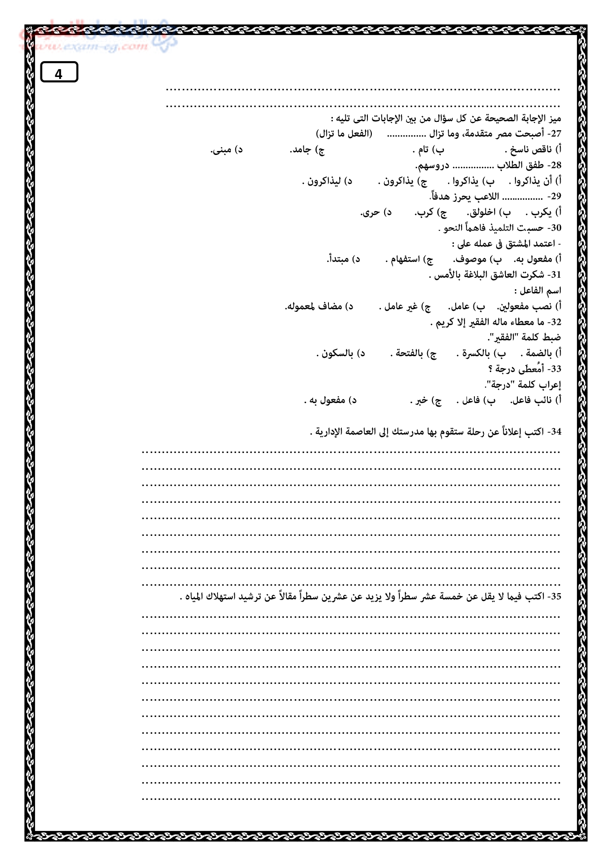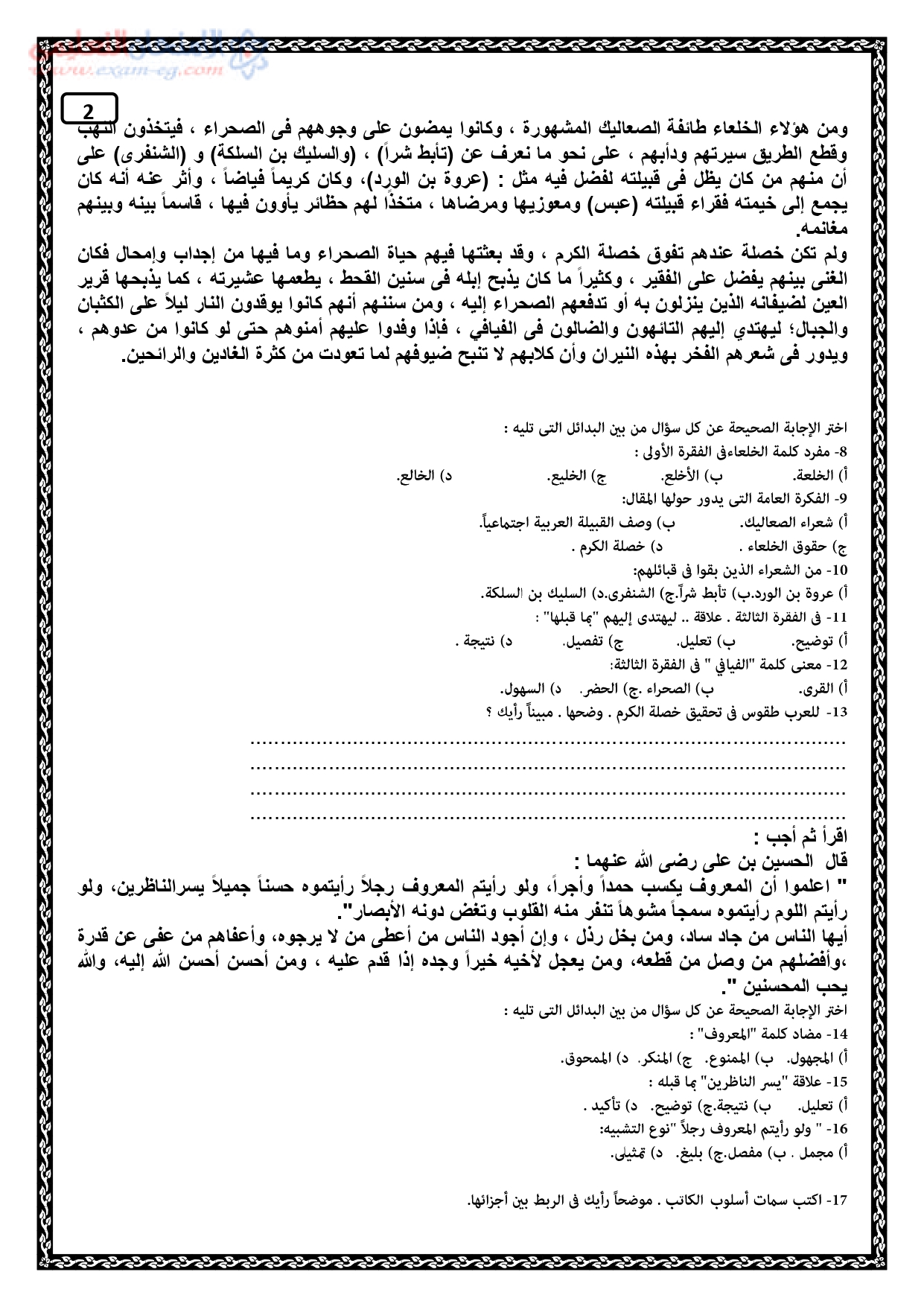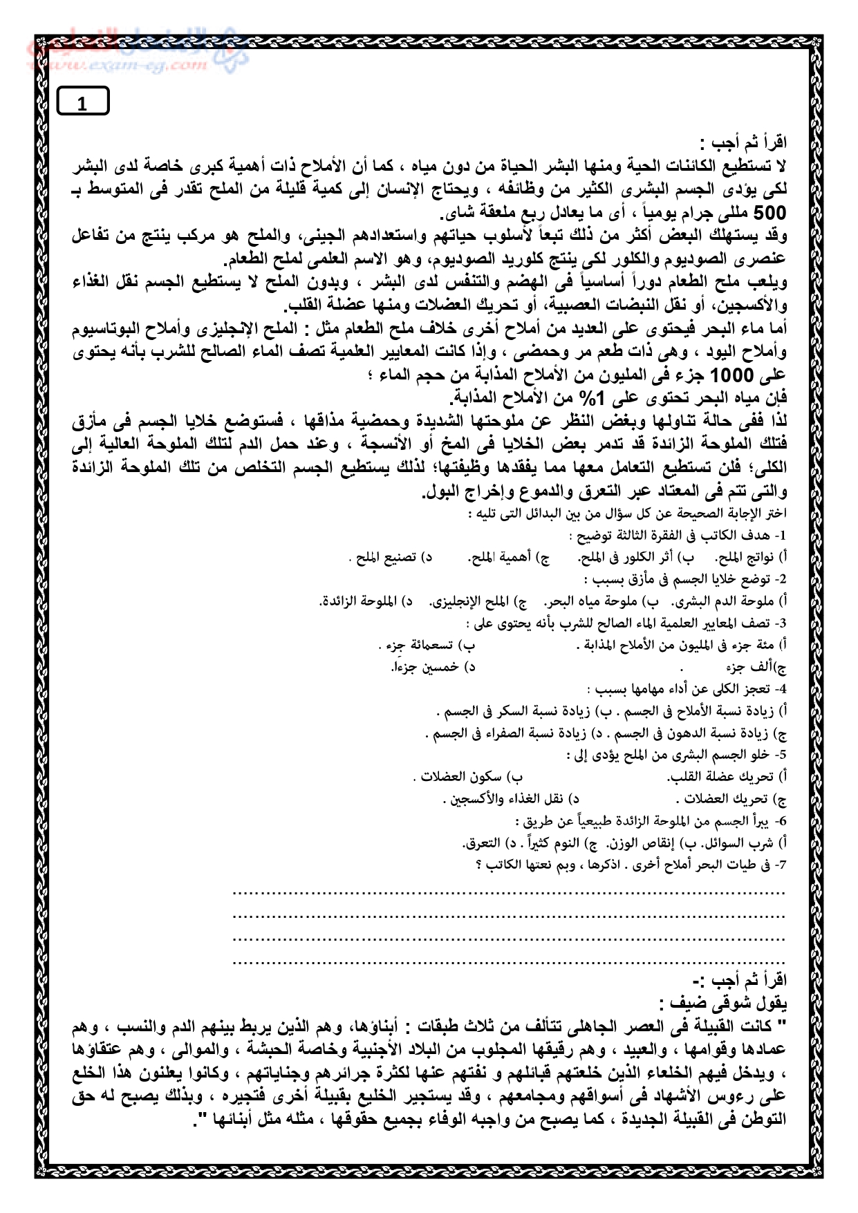امتحان الوزارة الاسترشادى في العربي لأولي ثانوي ترم أول 2020