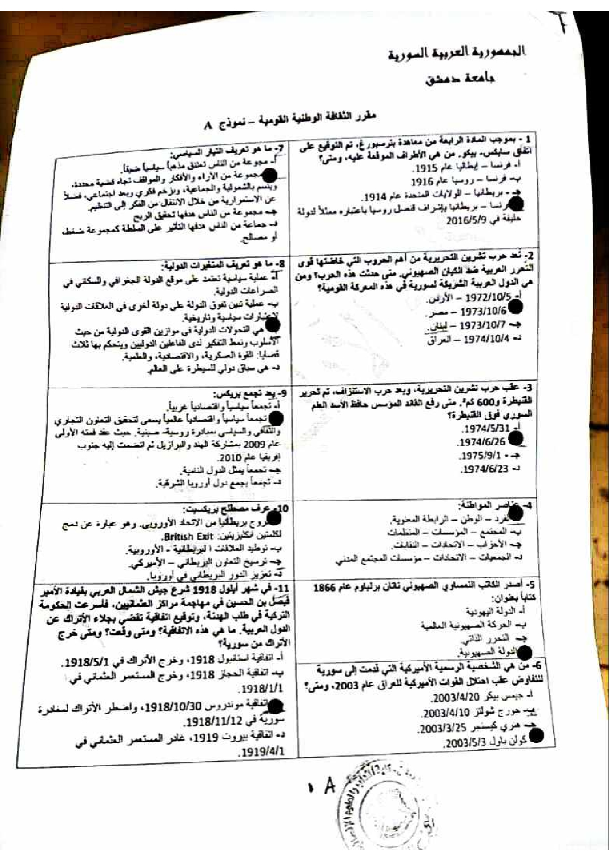 اسئلة اختبار في مادة الثقافة(القومية) كلية الآداب والعلوم الانسانية فصل اول عام 2021-2022 سنة اولى جامعة دمشق