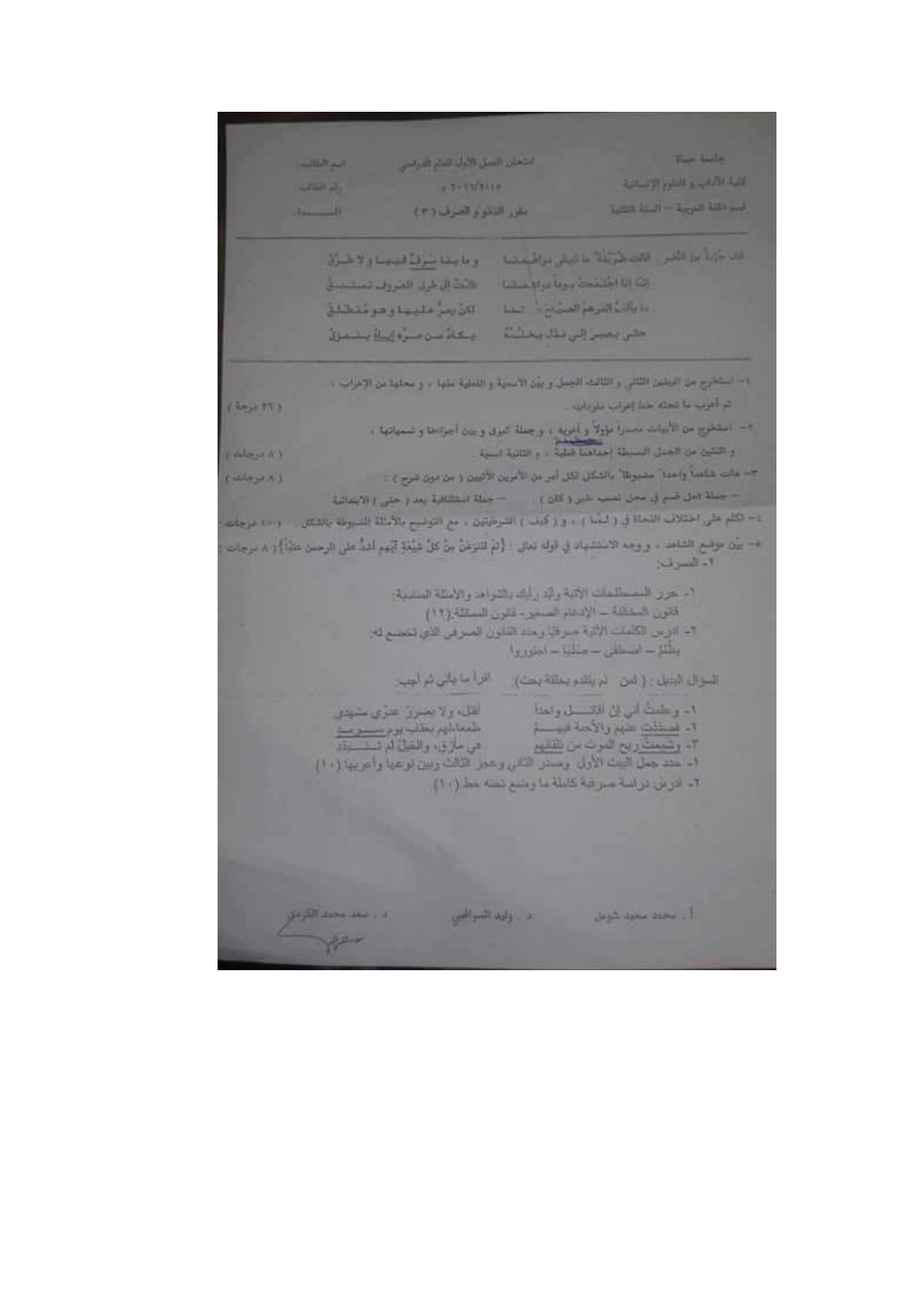 اسئلة اختبار مادة علم النحو والصرف2 للسنة2 الفصل 2 عام 2015-2016 كلية الآداب قسم اللغة العربية جامعة حماه