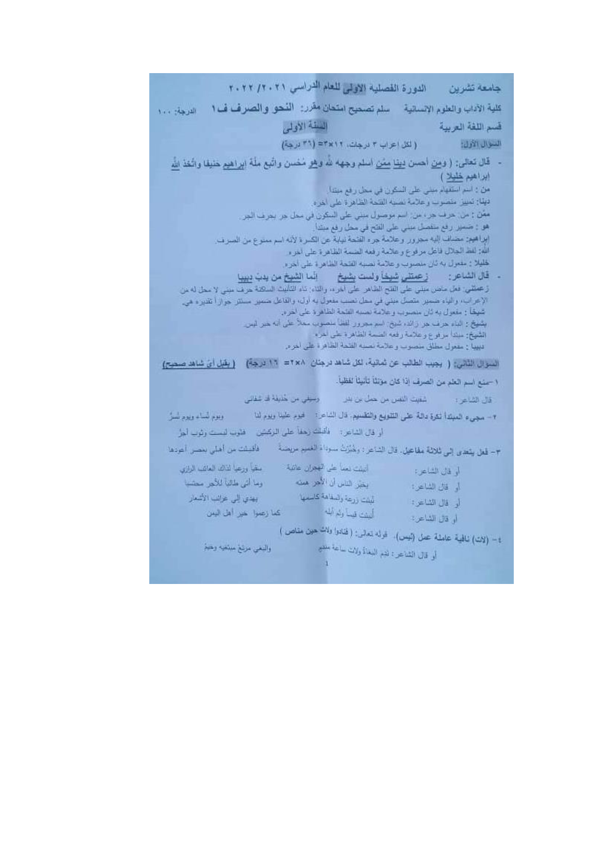اسئلة اختبارفي مادة النحو والصرف للسنة 1الفصل1عام2020-2021 كلية الآداب قسم اللغة العربية جامعة تشرين