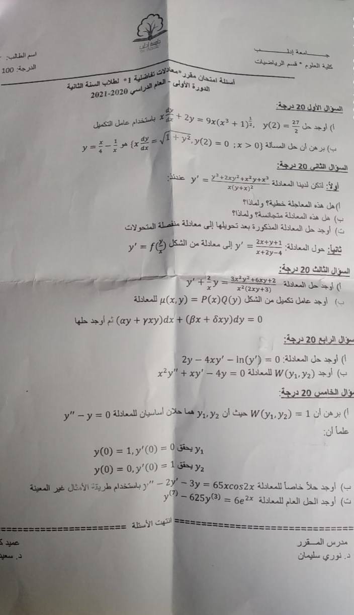اسئلة اختبار معادلات تفاضلية1 للسنة2عام 2020-2021جامعة ادلب قسم رياضيات
