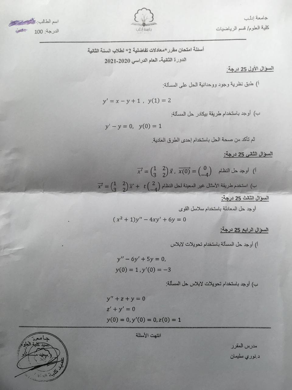 اسئلة اختبار معادلات تفاضلية2 سنة2 فصل2 عام 2020-2021 ادلب قسم رياضيات