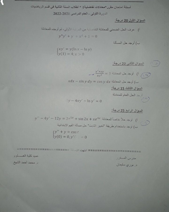 اسئلة اختبار معادلات تفاضلية1 للسنة2 فصل اول عام 2021-2022 ادلب رياضيات
