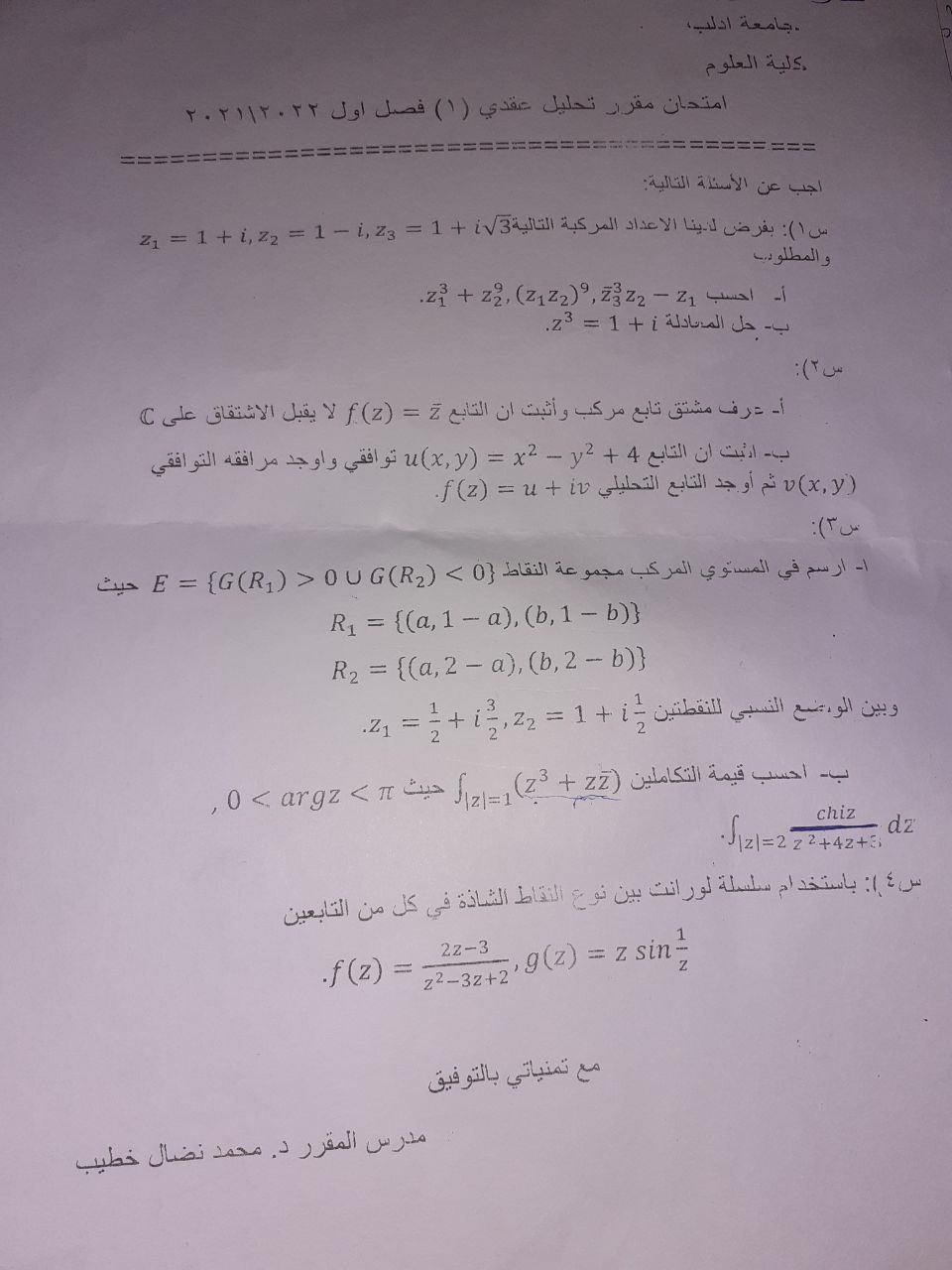 اسئلة اختبار في مادة التتحليل العقدي1 للسنة4 فصل اول عام 2021-2022 جامعة ادلب كلية العلوم قسم رياضيات