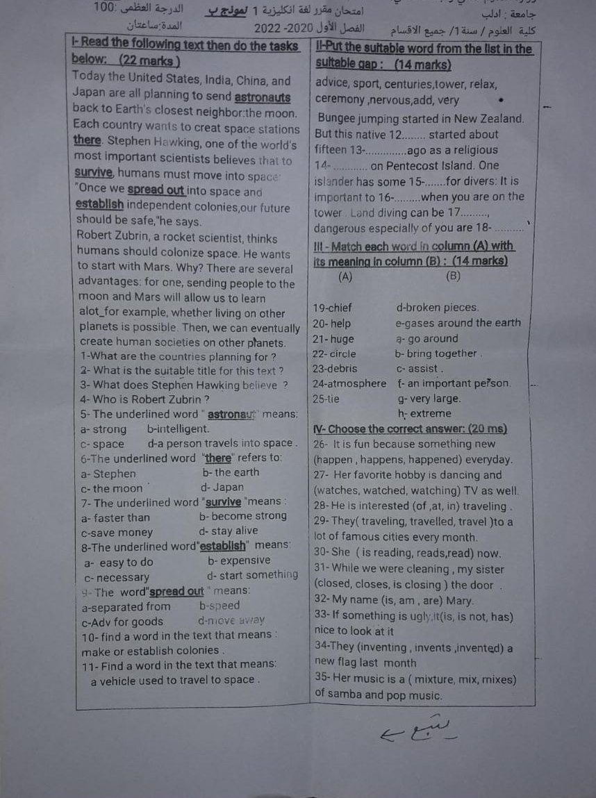اسئلة اختبار في مادة اللغة الانجليزية1 للسنة1 فصل اول عام 2021-2022 جامعة ادلب كلية العلوم جميع الاقسام