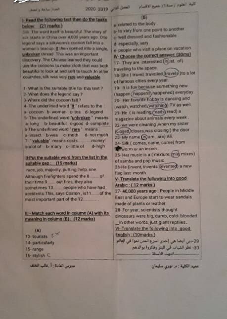 اسئلة اختبار لغة انجليزية2 للسنة1 فصل 2 عام2019-2020 ادلب كلية العلوم جميع الاقسام