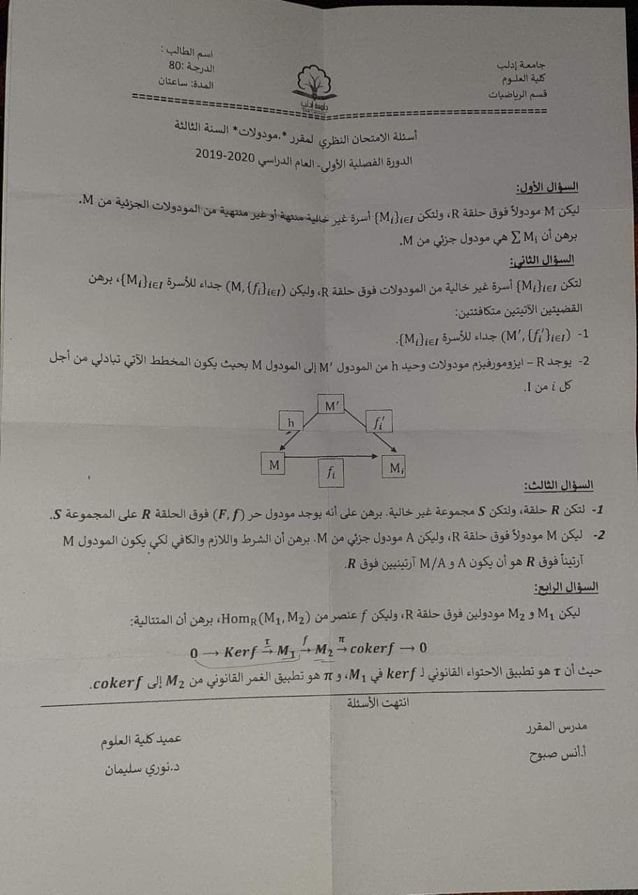 اسئلة اختبار في مادة المودولات للسنة3 فصل 1 عام2019-2020 جامعة ادلب كلية العلوم قسم رياضيات
