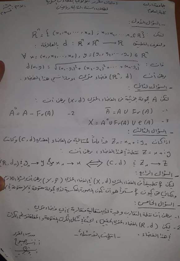 اسئلة اختبار في تبولوجيا الفضاءات المترية للسنة2 جامعة ادلب رياضيات