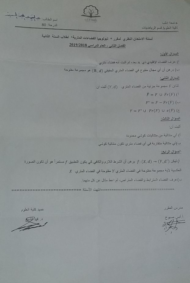 اسئلة اختبار في تبولوجيا الفضاءات المترية للسنة2 فصل 2 عام 2018-2019جامعة ادلب رياضيات