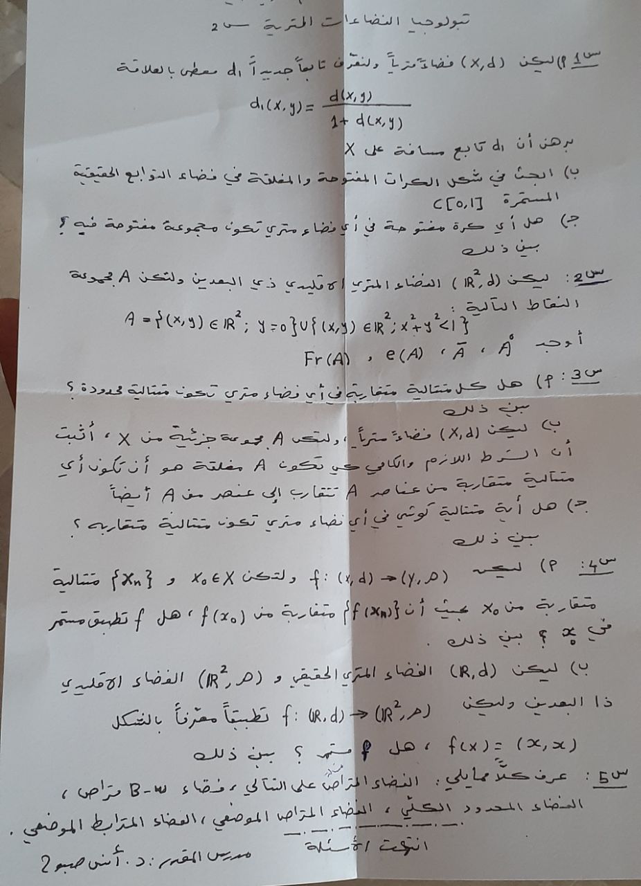 اسئلة اختبار في تبولوجيا الفضاءات المترية للسنة2 عام 2020جامعة ادلب رياضيات