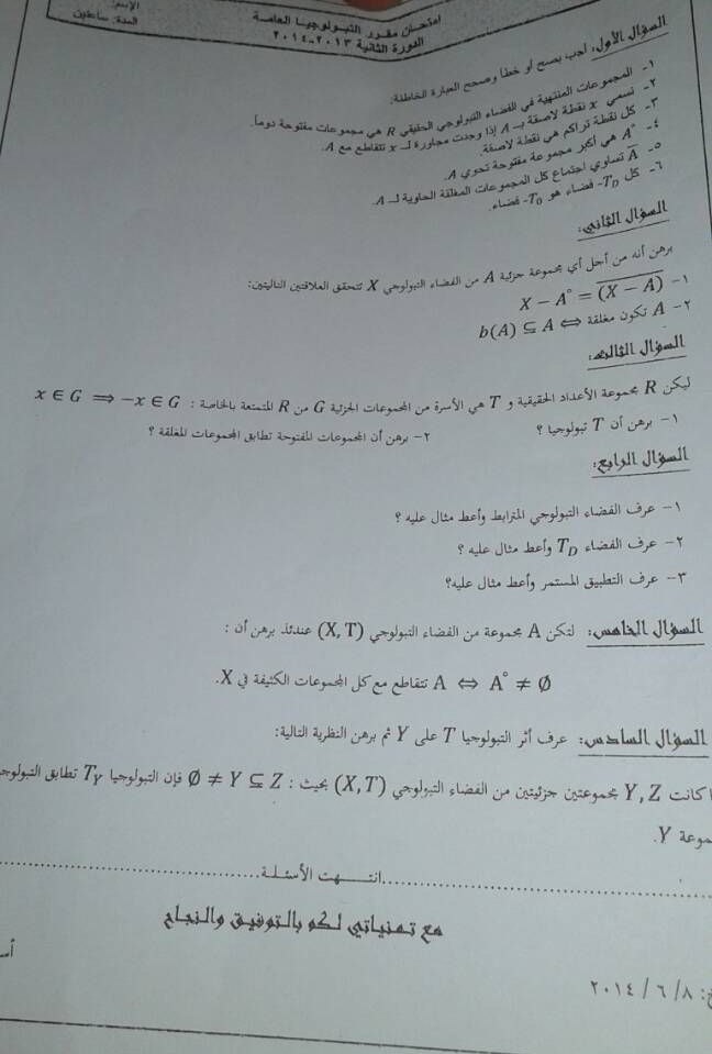 اسئلة اختبار في مادة التبولوجيا العامة للسنة3فصل2 عام2013-2014 جامعة ادلب كلية العلوم قسم رياضيات