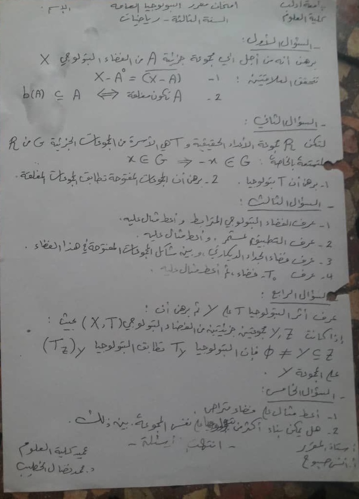 اسئلة اختبار في مادة التبولوجيا العامة للسنة3 جامعة ادلب كلية العلوم قسم رياضيات