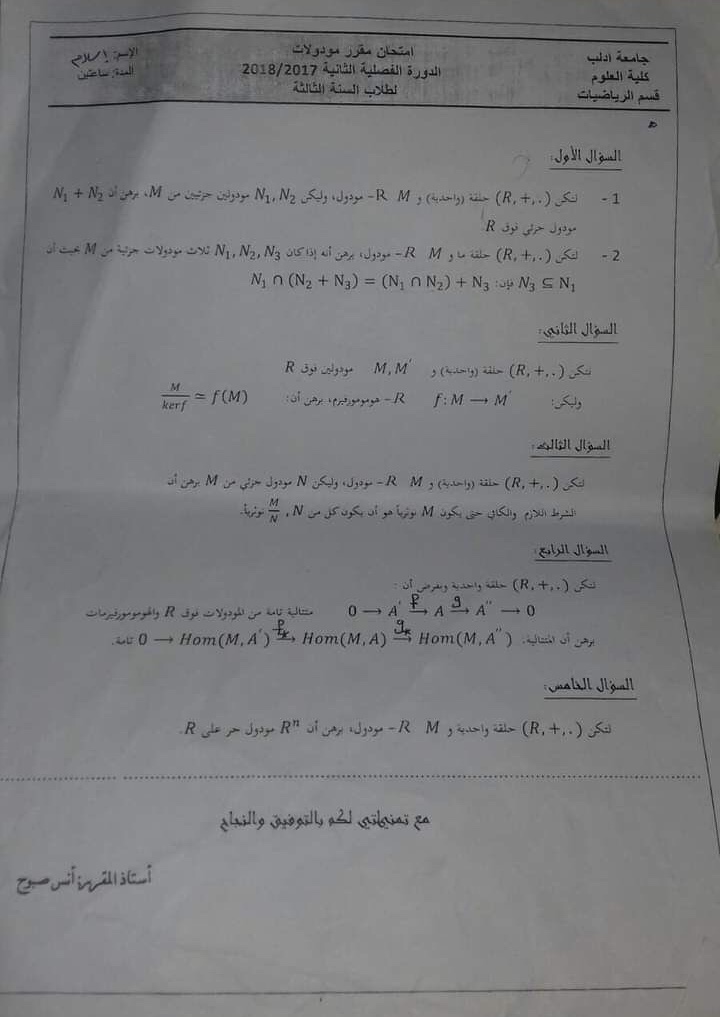 اسئلة اختبار في مادة المودولات للسنة3 فصل2 عام 2018-2017 جامعة ادلب كلية العلوم قسم رياضيات