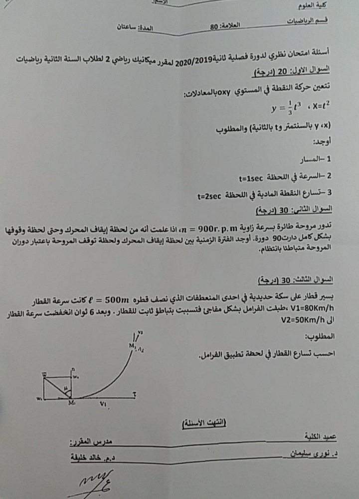 اسئلة اختبار في مادة ميكانيك رياضي2للسنة2 فصل2عام2019-2020 ادلب رياضيات