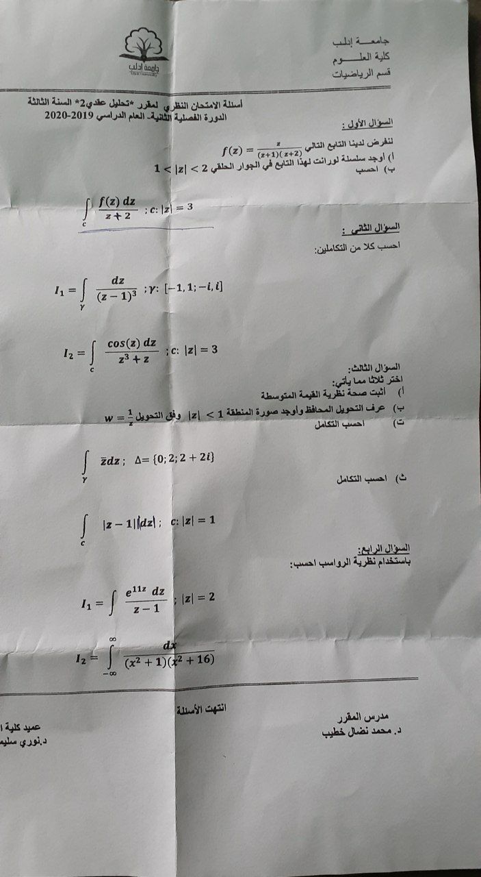 اسئلة اختبار في مادة التحليل العقدي2 للسنة3 فصل2عام 2019-2020 جامعة ادلب كلية العلوم قسم رياضيات