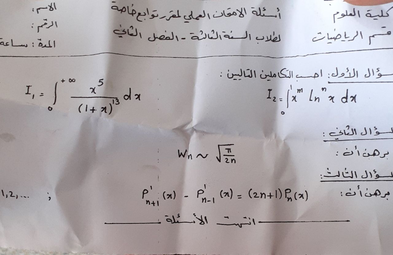 اسئلة اختبار عملي في مادة التوابع الخاصة للسنة3 فصل2 عام2018-2019 جامعة ادلب كلية العلوم قسم رياضيات