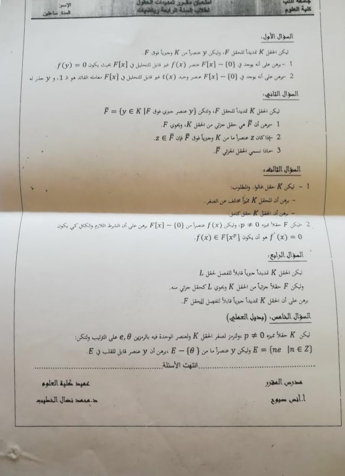 اسئلة اختبار في مادة تمديدات الحقول للسنة4 جامعة ادلب كلية العلوم قسم رياضيات