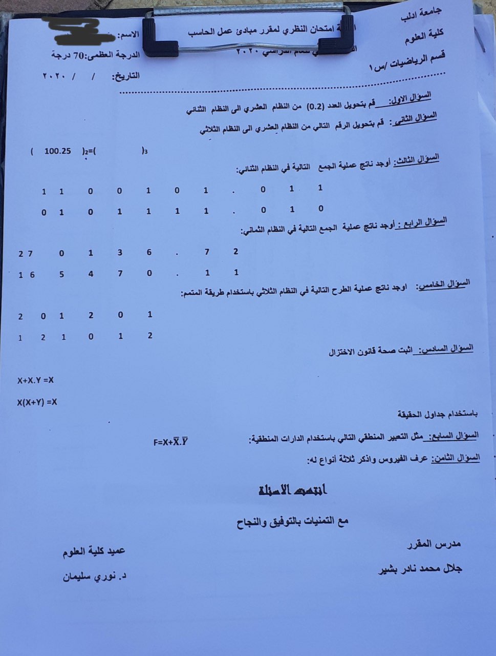 اسئلة اختبار في مادة مبادئ علم الحواسيب للسنة1 فصل2 عام2020جامعة ادلب رياضيات