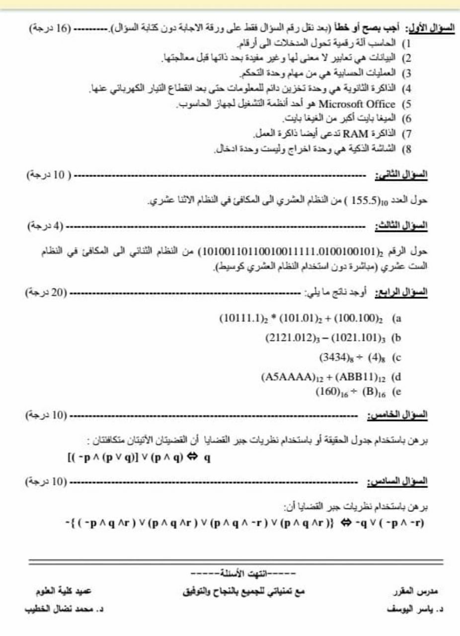 اسئلة اختبار في مادة مبادئ علم الحواسيب للسنة1 جامعة ادلب رياضيات