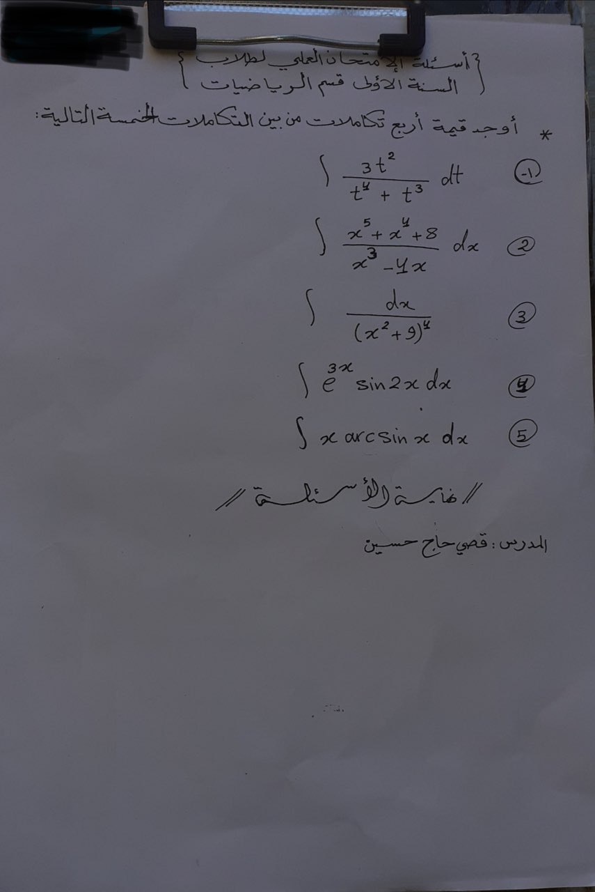 اسئلة اختبار عملي في مادة الحساب التكاملي للسنة1 جامعة ادلب رياضيات
