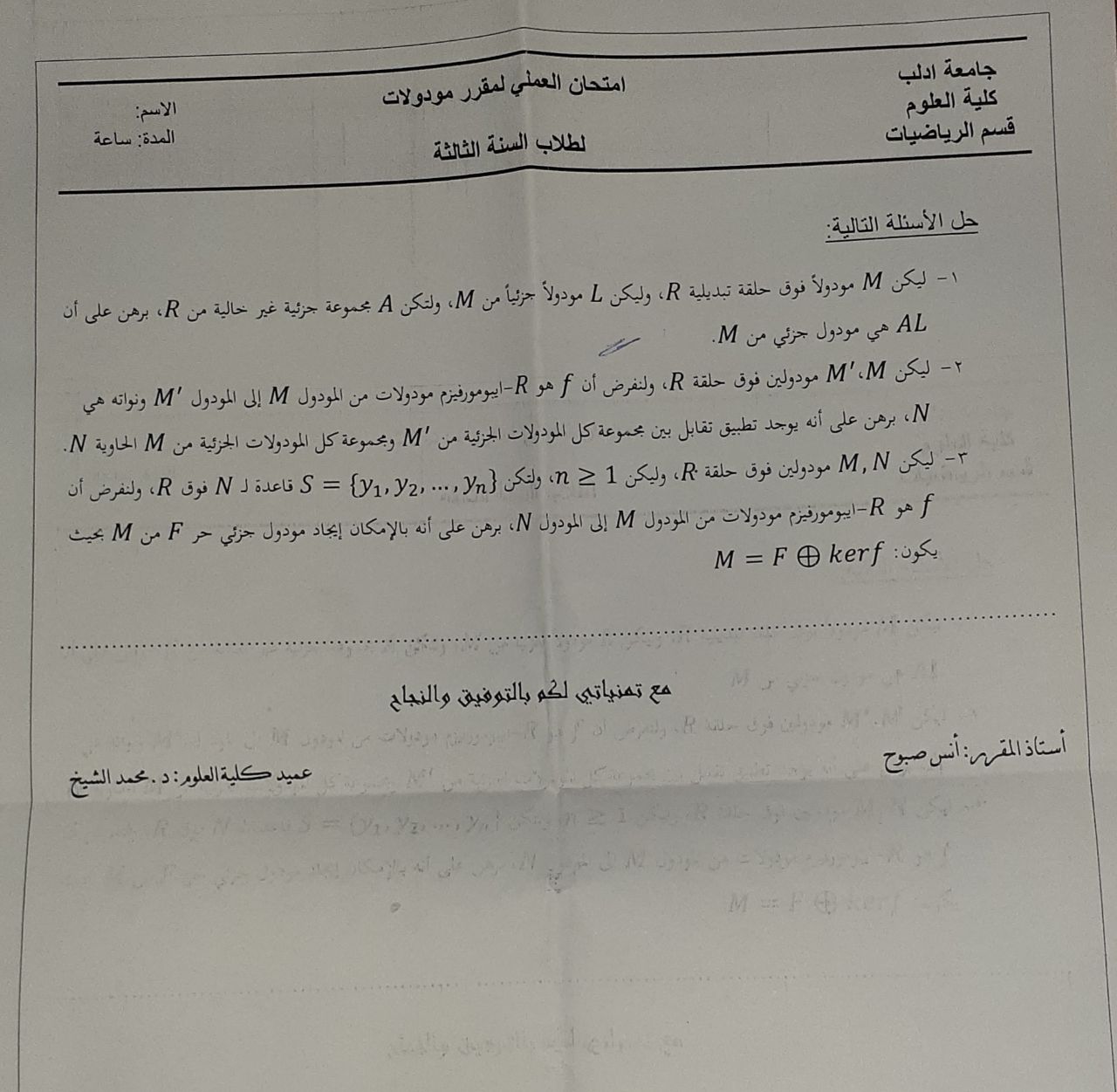 اسئلة اختبار عملي في مادة المودولات للسنة3 جامعة ادلب كلية العلوم قسم رياضيات
