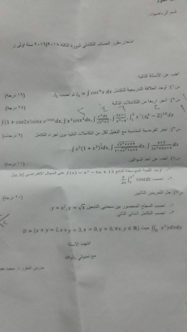 اسئلة اختبار في مادة الحساب التكاملي للسنة1 فصل3 عام2018-2019جامعة ادلب كلية العلوم قسم رياضيات