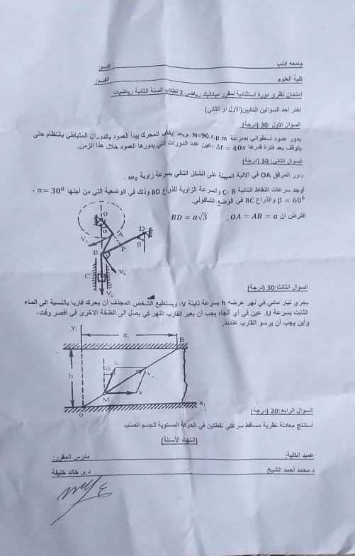 اسئلة اختبار في مادة الميكانيك الرياضي2 للسنة2 فصل3 جامعة ادلب رياضيات