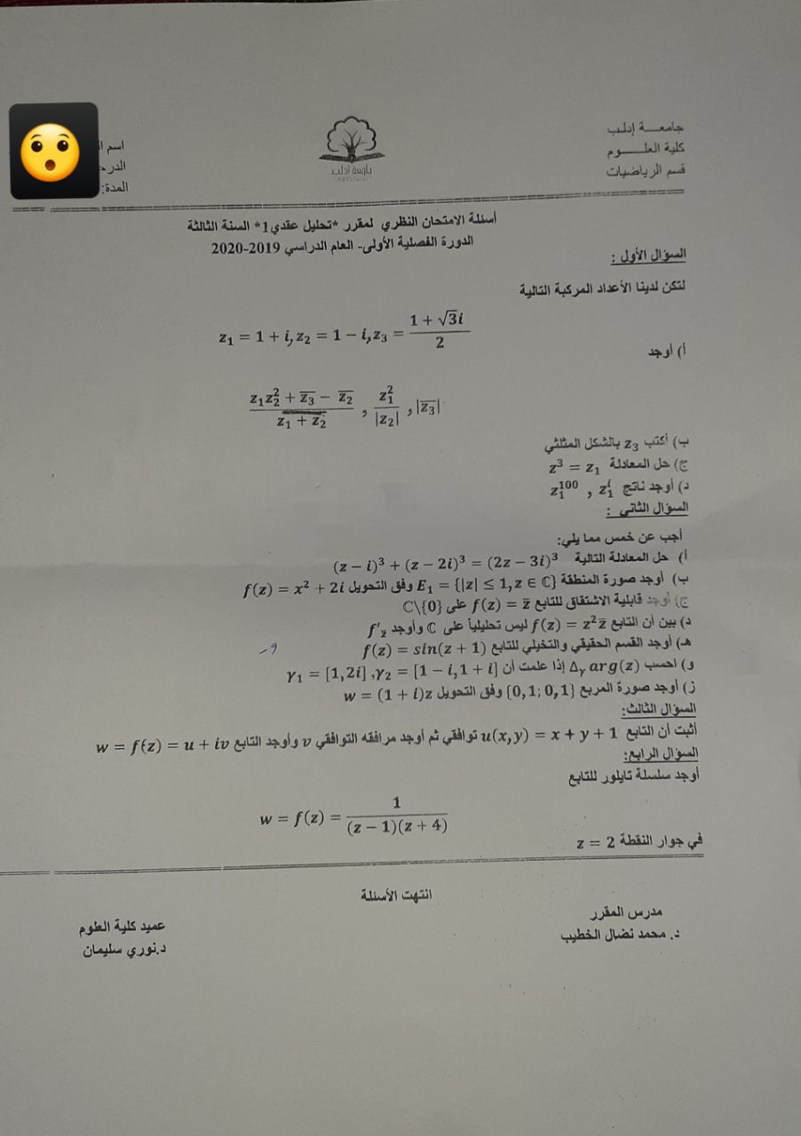 اسئلة اختبار في مادة تحليل عقدي1 للسنة3 فصل1 عام2020-2019 جامعة ادلب كلية العلوم قسم رياضيات
