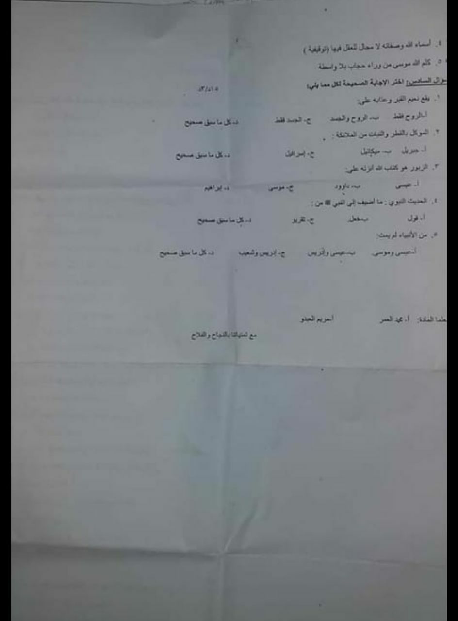 اسئلة اختبار في مادة اصول الايمان للسنة1 جامعة ادلب رياضيات
