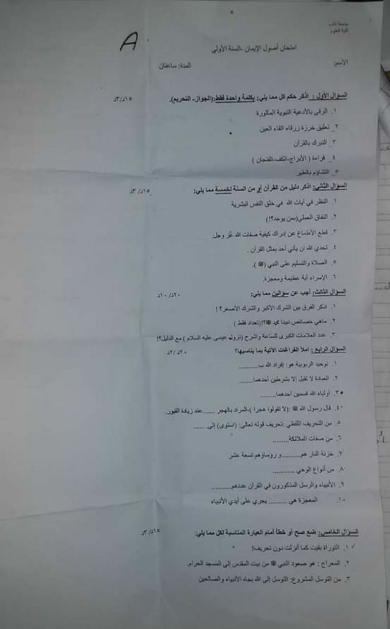 اسئلة اختبار في مادة اصول الايمان للسنة1 جامعة ادلب كلية العلوم قسم رياضيات