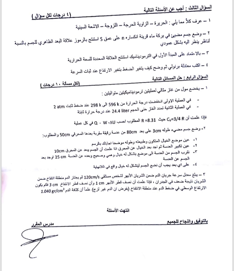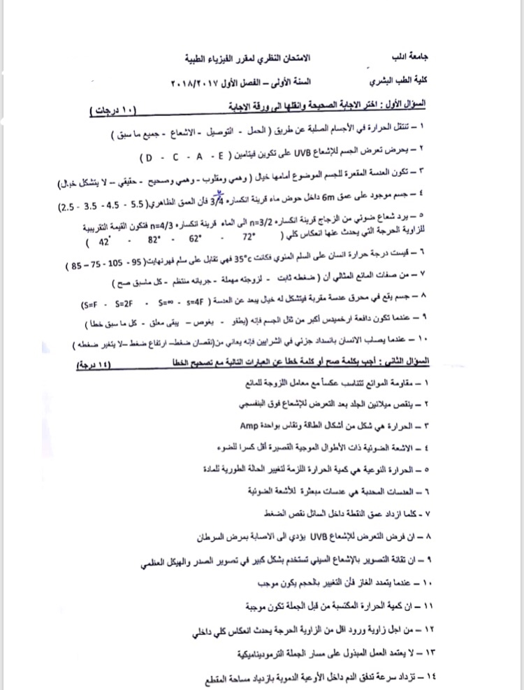 اسئلة اختبار في مادة الفيزياء الطبية للسنة1 فصل1 عام2017 -2018 جامعة ادلب كلية الطب البشري