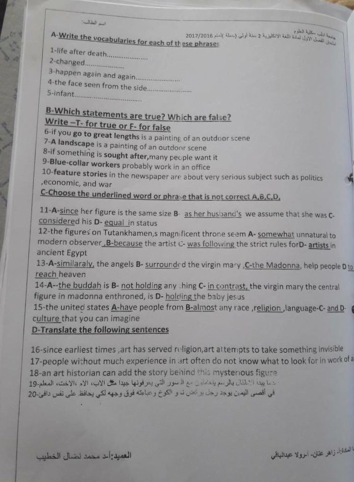 اسئلة اختبار في مادة اللغة الانجليزية2 للسنة1 (حملة)عام 2016-2017 جامعة ادلب