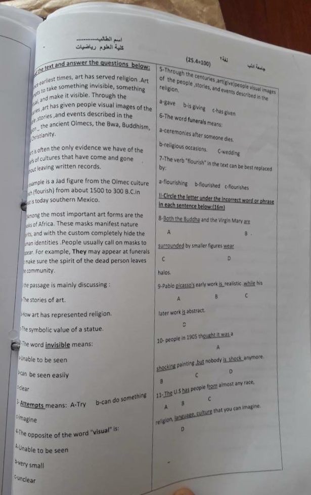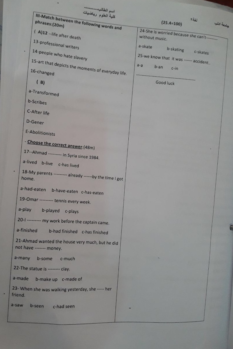 اسئلة اختبار في مادة اللغة الانجليزية2 للسنة1 جامعة ادلب رياضيات